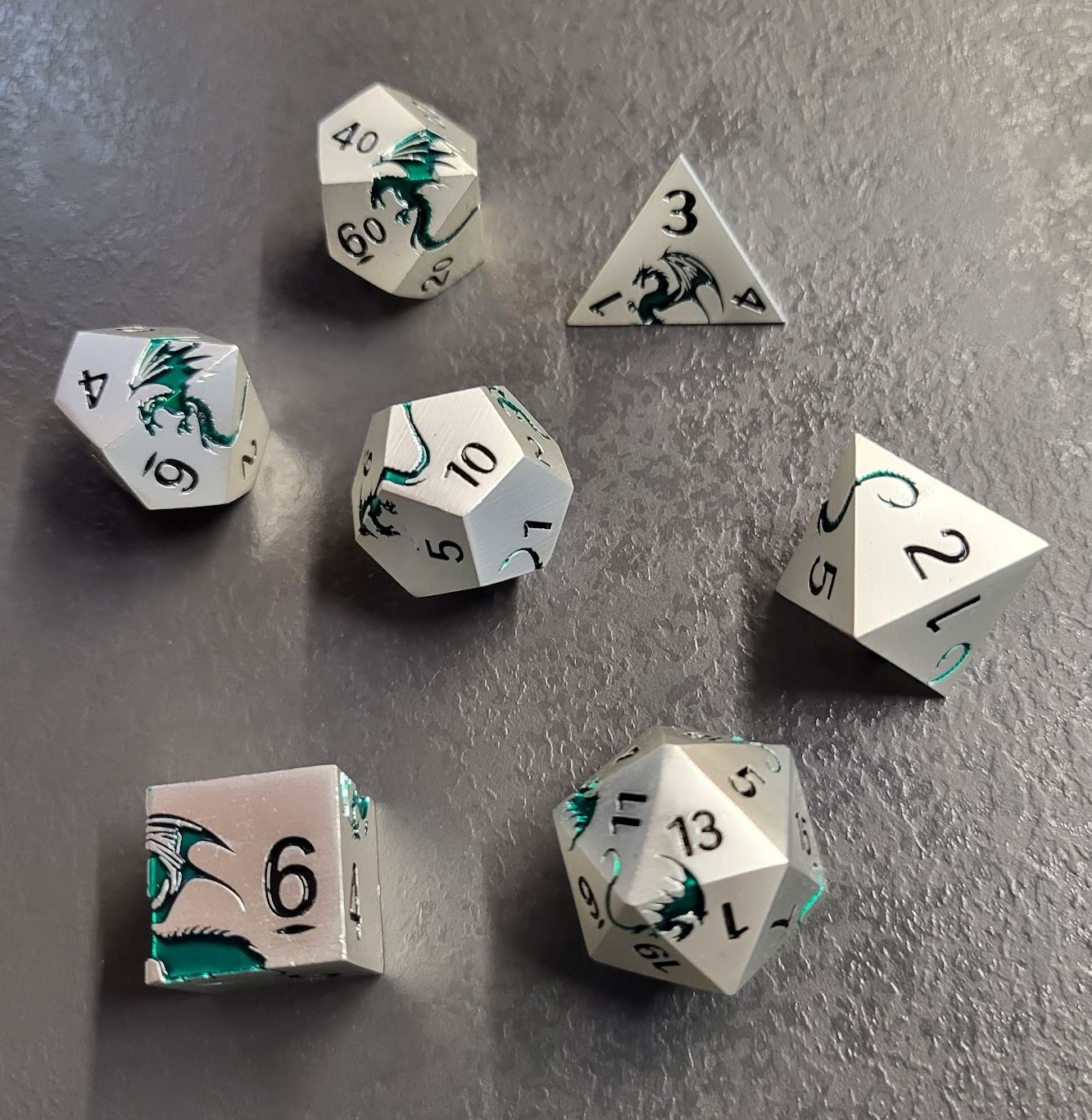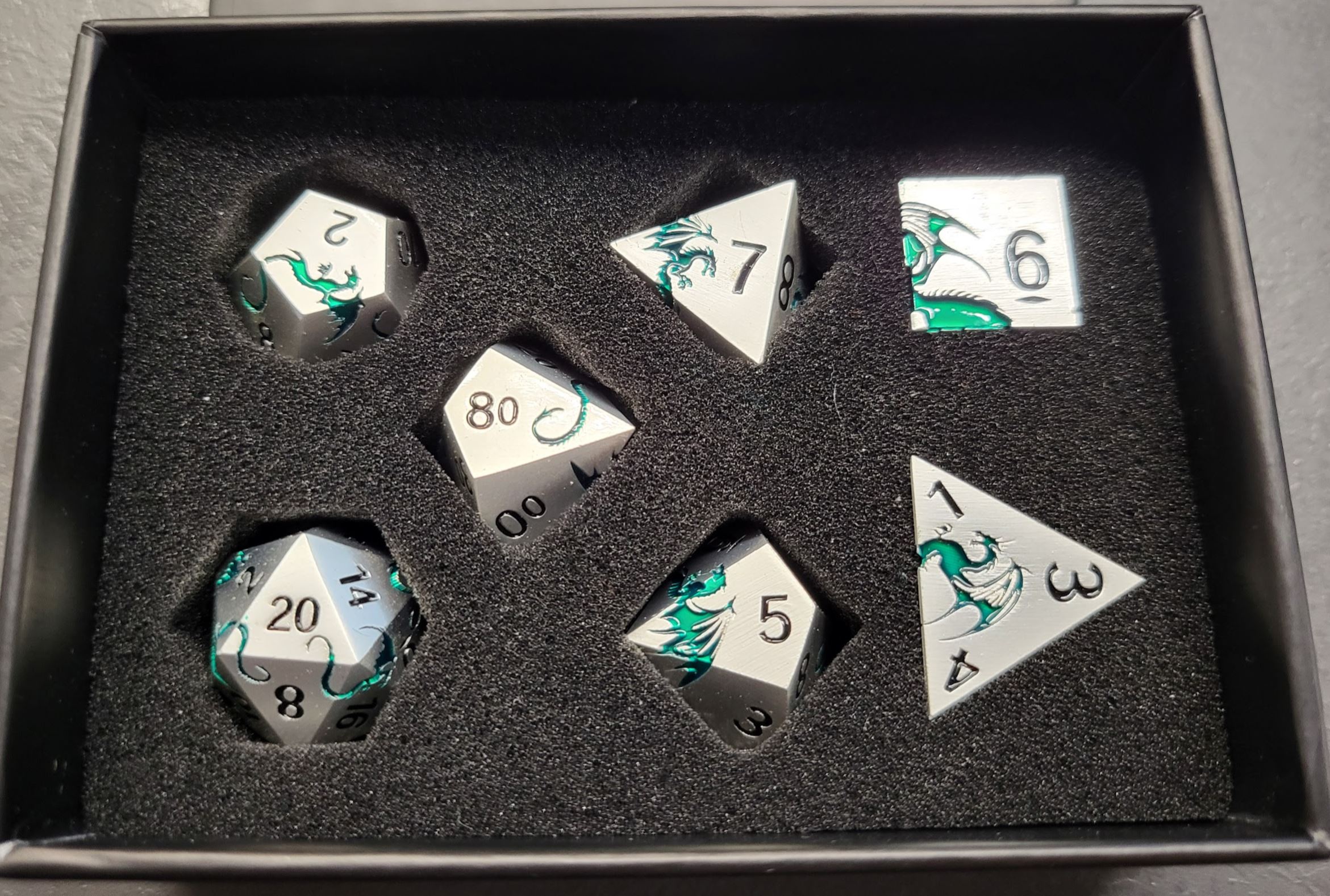 Magnifique set de dés argentés en métal lourd avec dragon vert incrusté.