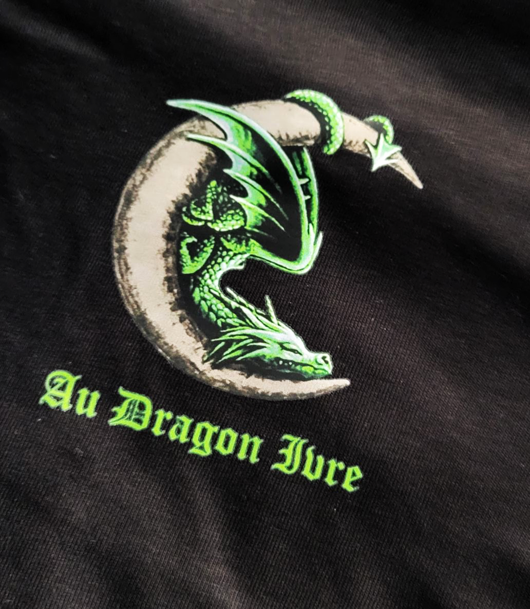 T-shirt manche courte noir » au dragon ivre » avec le logo marquage à chaud professionnel sur le coeur